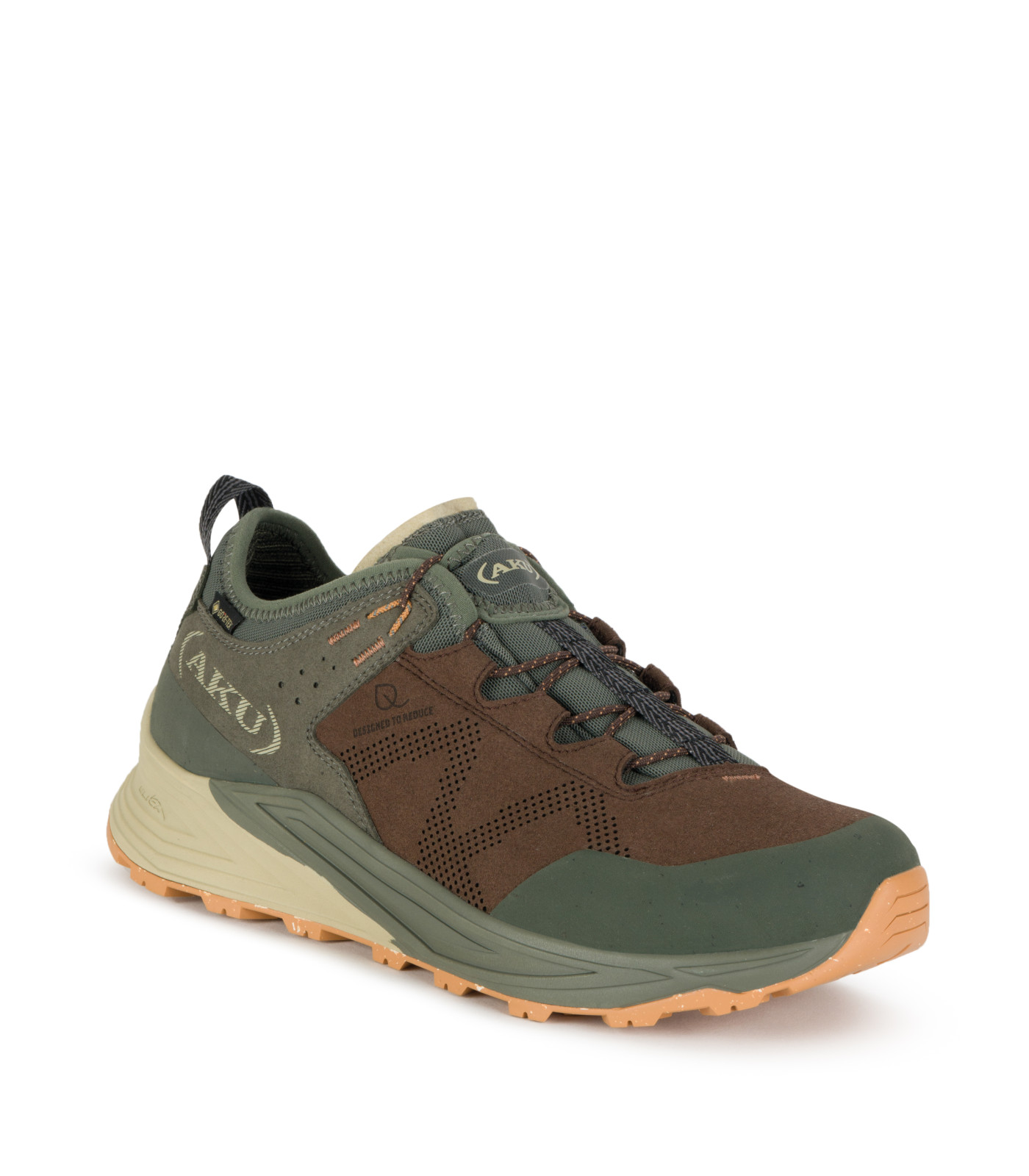 The AKU OMNIA V-LIGHT GTX is an ultra-versatile shoe designed to accompany your outdoor adventures as well as in the city. Lightweight, comfortable, and environmentally friendly, it is perfect for light hiking, electric biking, or dynamic urban use. The upper, made from recycled and non-animal materials, is PFAS-free, just like its waterproof and breathable GORE-TEX® membrane, made from recycled PE. This makes it a highly functional model, as well as ethical and durable. The AKU Kaly Tenuta Grip outsole, partially made of recycled rubber, is designed for optimal grip, especially thanks to its asymmetrical design and reinforced toe with increased density, perfect for better grip on bike pedals. With AKU Elica Natural Stride technology, the sole follows the natural movement of the foot for better rolling and increased biodynamic efficiency. The double-density EVA midsole, co-molded to reduce glues, improves cushioning while reducing the ecological impact. Finally, the partially recycled Ortholite® insole ensures comfort and breathability. Made in Vietnam in accordance with AKU sustainability standards, this shoe embodies the perfect balance between technicality, comfort, and environmental responsibility.